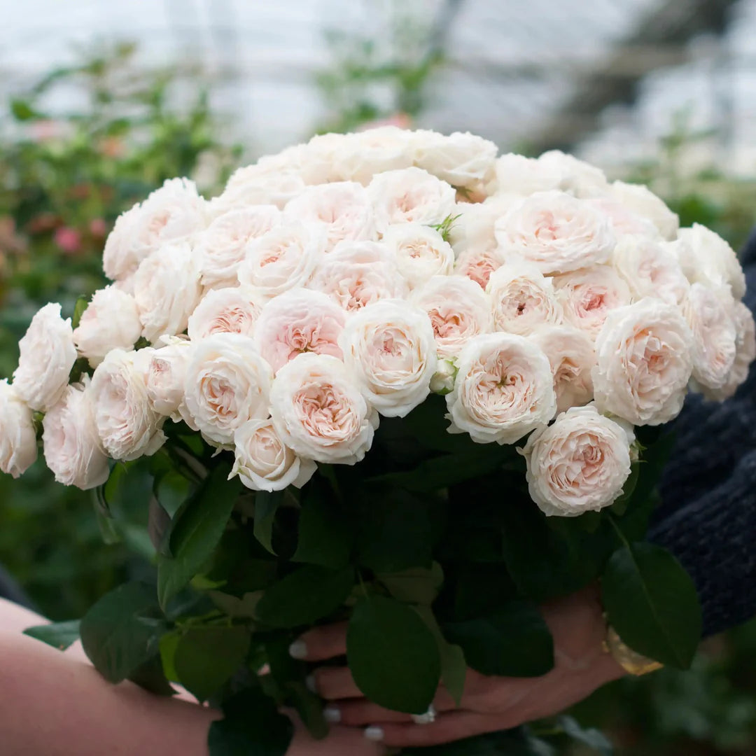 Norine features crisp white petals softly blending into blush pink centers, creating a refined ombré appearance. Ideal for wedding florals, pastel garden themes, and elegant, understated luxury designs. Due to lower disease resistance, attentive management is essential.
