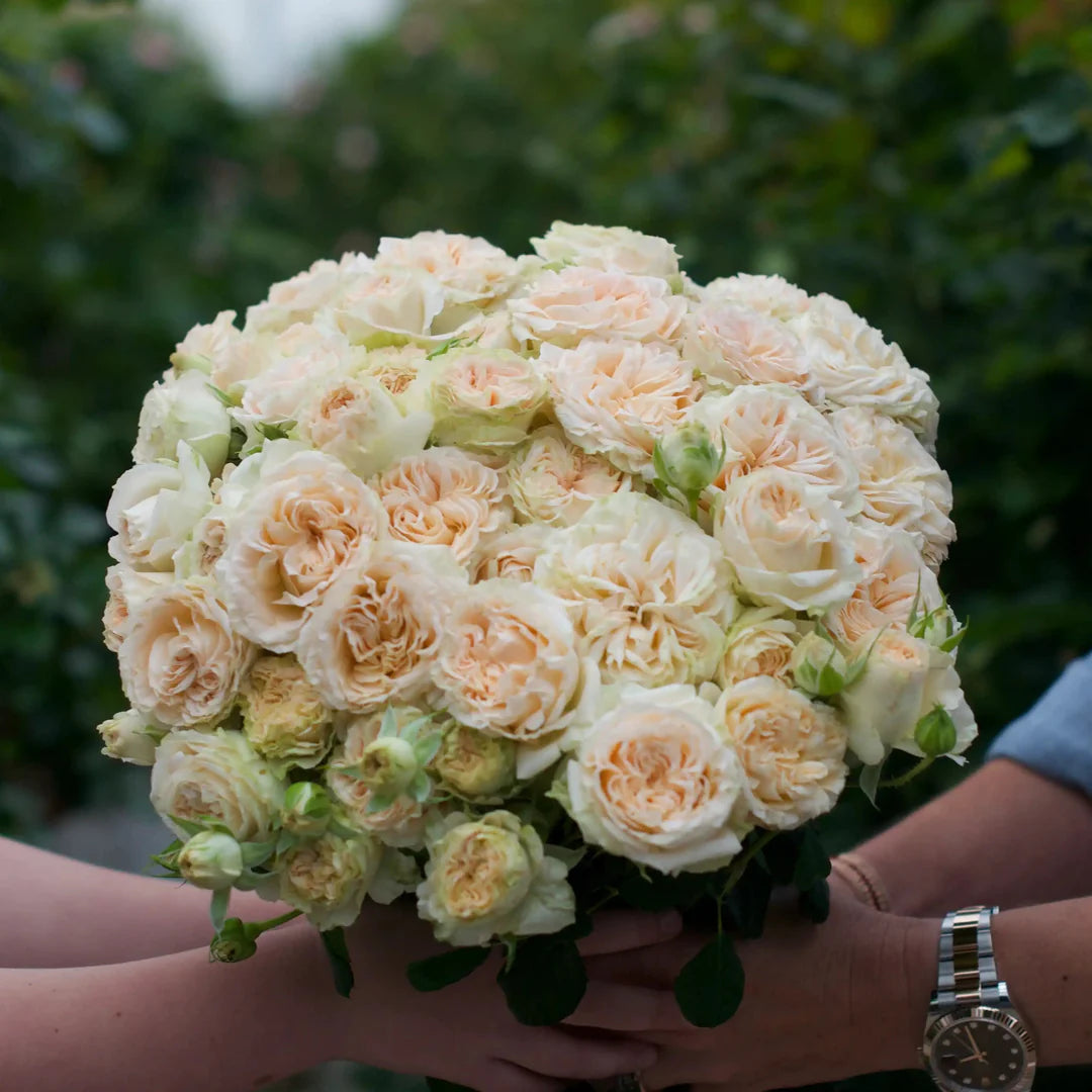 Summerrose features delicate ombré blooms shifting from pale green to creamy white, accented with a soft apricot center. Glossy foliage enhances its refined appearance. With frequent blooming cycles, it produces abundant romantic flowers throughout the season. Best suited for growers comfortable with detailed care.